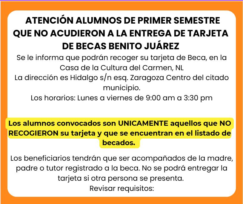 El Conalep NL Ciénega de Flores “Joel Rocha Barocio” informó a los alumnos de primer semestre que no acudieron a la entrega de la tarjeta de la Beca Universal de Educación Media Superior “Benito Juárez” que aún podrán recogerla en una sede alterna, siempre y cuando formen parte del listado oficial de estudiantes becados.