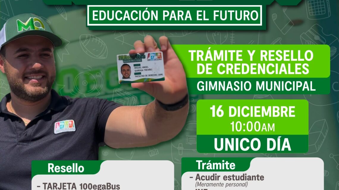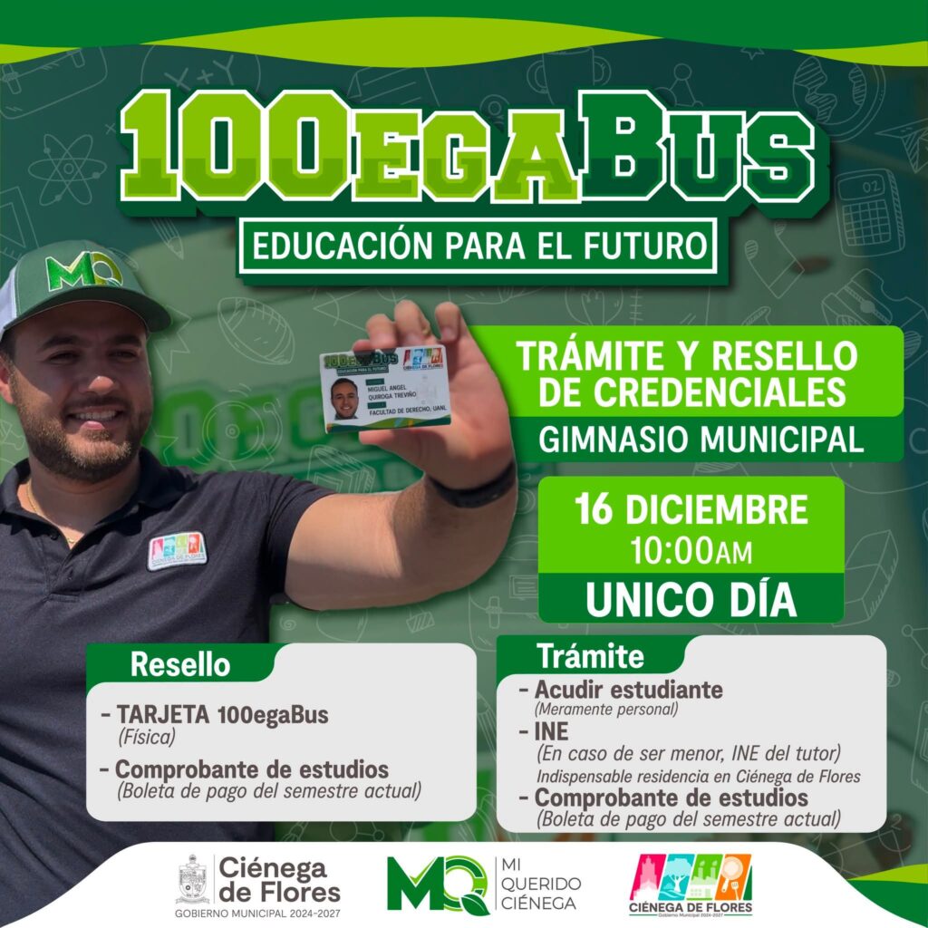 El Gobierno de Ciénega de Flores informó que el próximo 16 de diciembre, a partir de las 10:00 de la mañana, se llevará a cabo el resello y trámite de credenciales del programa 100egaBus, en las instalaciones del Gimnasio Municipal, como parte de las acciones para mantener el orden en el transporte estudiantil.