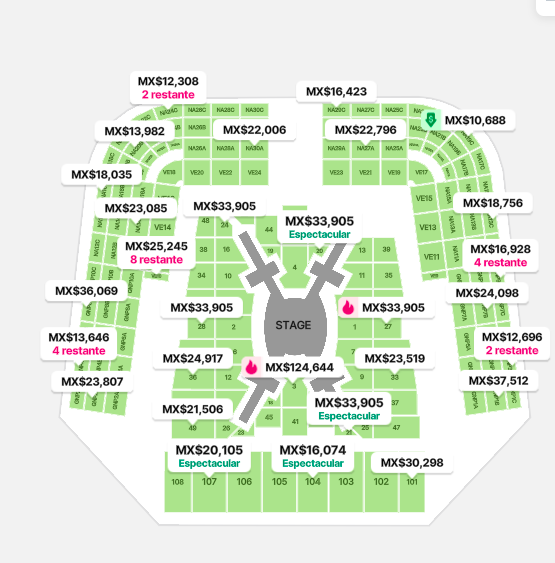 De acuerdo con los listados visibles en dicha plataforma, los precios más bajos rondan los 17 mil pesos, mientras que localidades como las secciones 1 y GNP1C alcanzan hasta 121 mil 992 pesos.