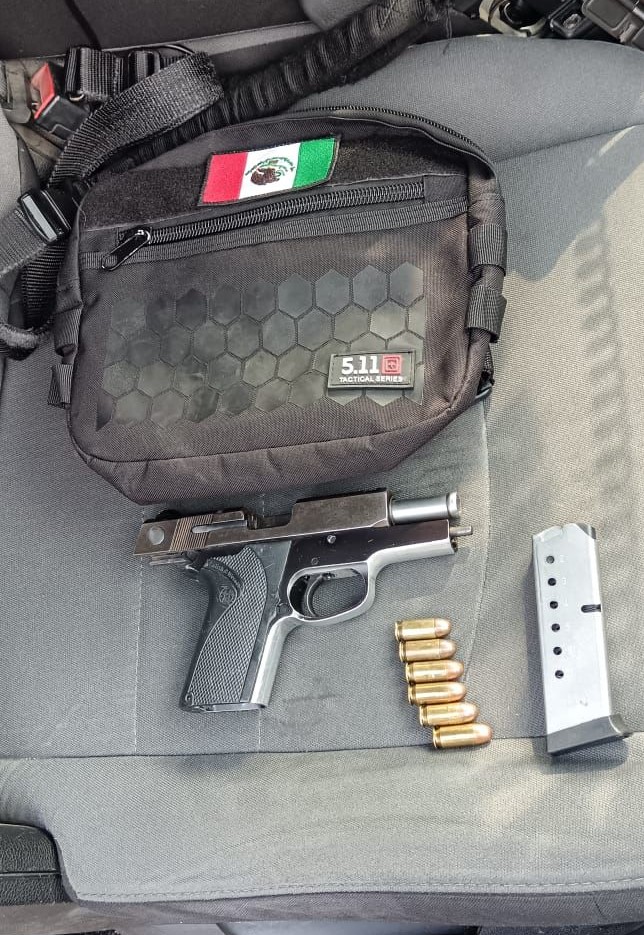 Durante la revisión, los policías localizaron dentro de una mochila tipo “mariconera” una pistola tipo escuadra con un cargador y seis cartuchos hábiles calibre .45 milímetros.