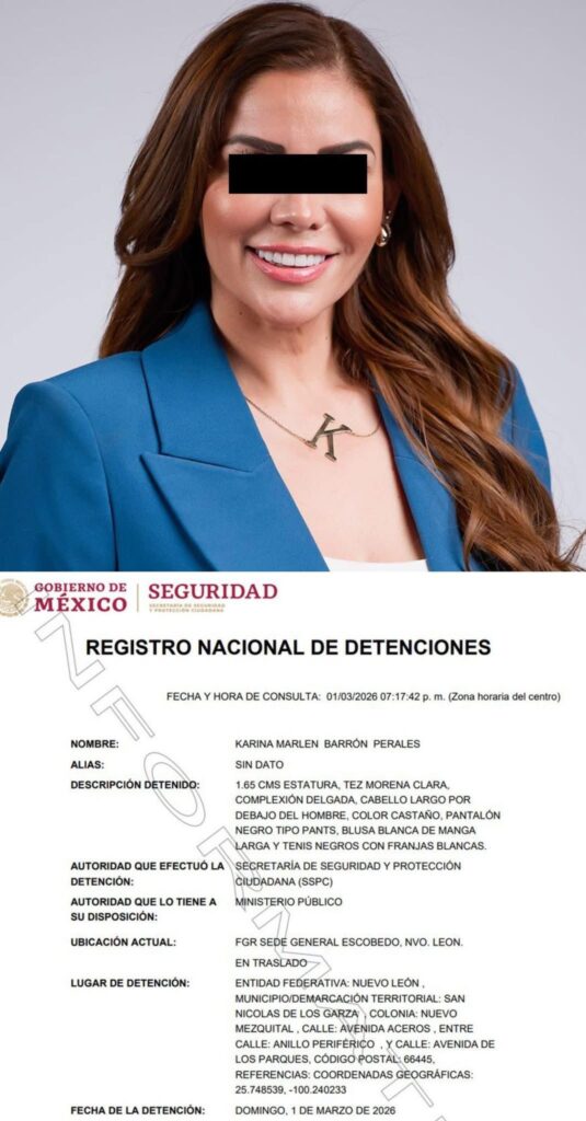 La tarde del domingo 1 de marzo fue detenida Karina “N”, quien se desempeñaba como secretaria de Desarrollo Humano e Igualdad Sustantiva del Gobierno de Monterrey.