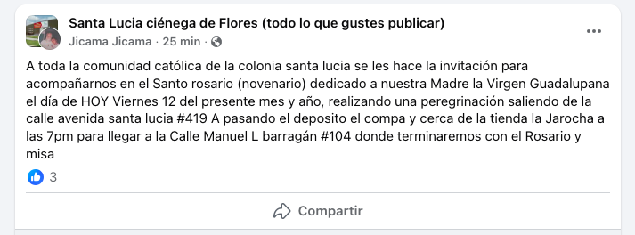 En el grupo comunitario “Santa Lucía Ciénega de Flores”, usuarios recordaron que este viernes se llevará a cabo un novenario y peregrinación en honor a la Virgen de Guadalupe.