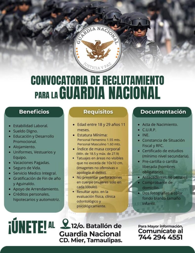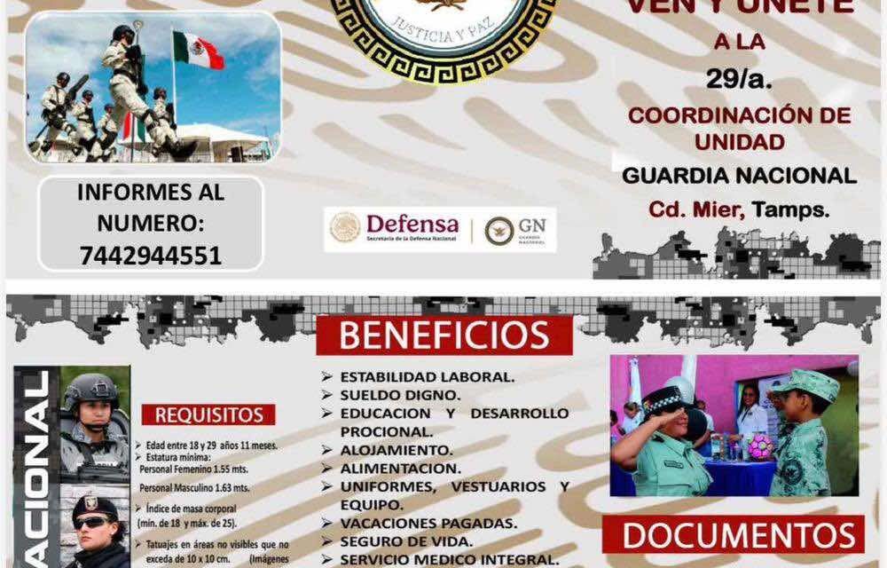 La Guardia Nacional lanzó una convocatoria de reclutamiento dirigida a jóvenes de entre 18 y 29 años 11 meses para integrarse a sus filas en el municipio de Ciudad Mier, Tamaulipas.