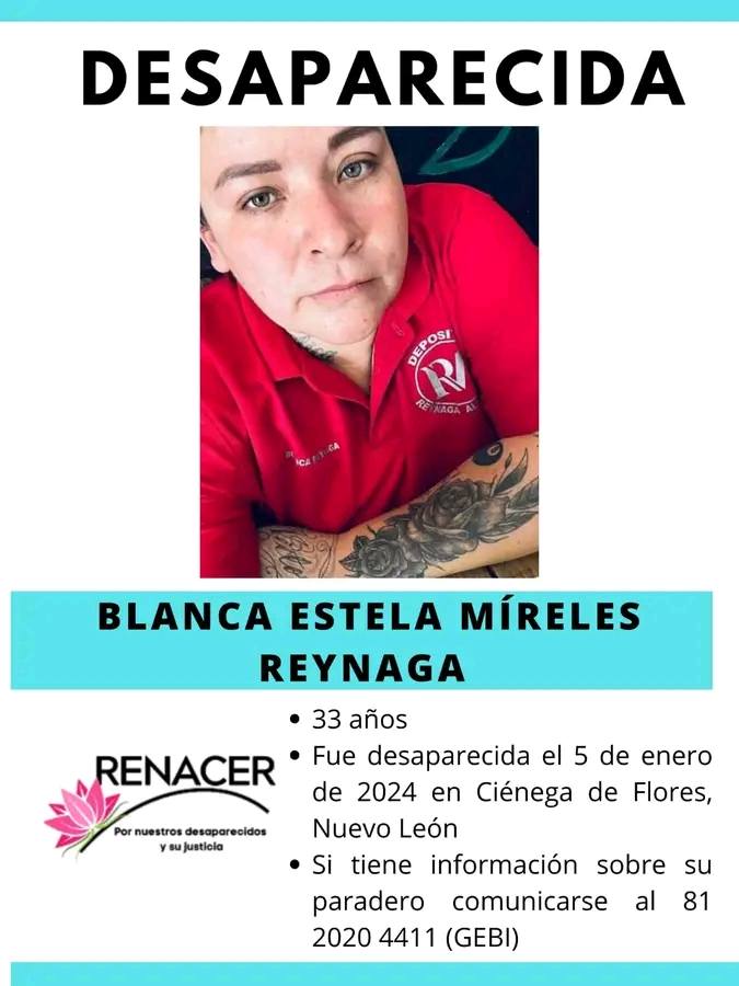 Blanca Estela Reynaga Mireles desapareció el 5 de enero de 2024 en la colonia San Juan, calle Jazmín #1000, en Ciénega de Flores. Es de complexión rellenita, mide 1.60 metros, tiene piel blanca y cabello corto negro.