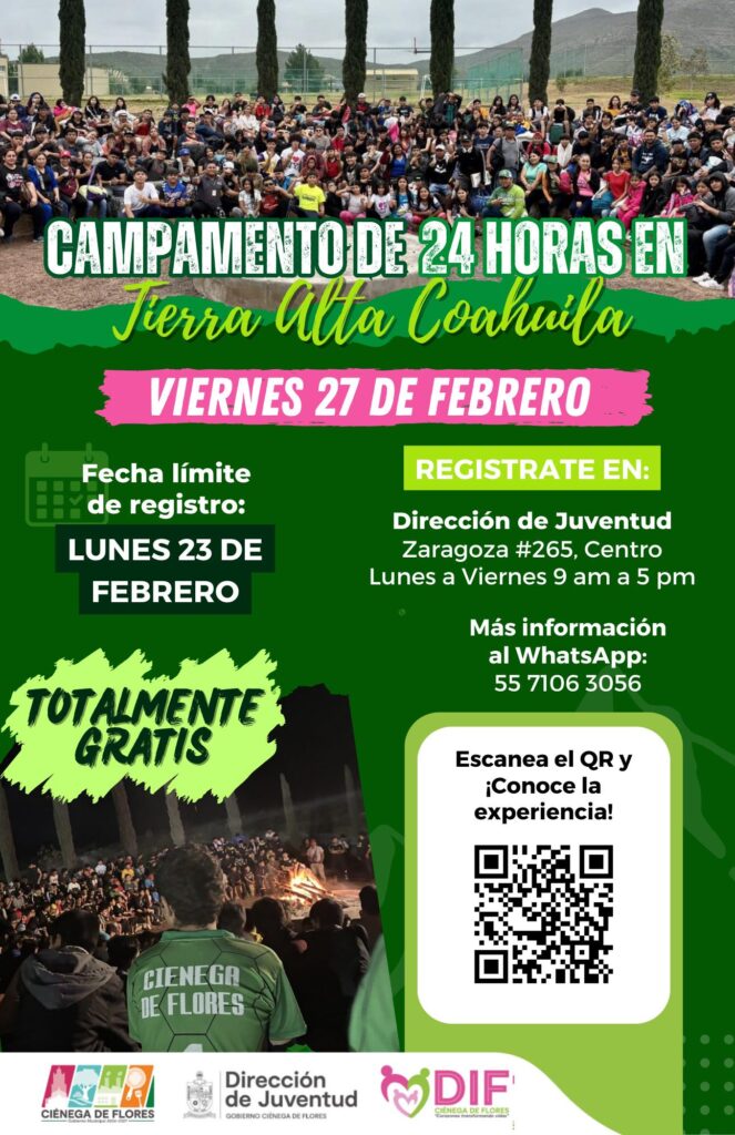El DIF municipal de Ciénega de Flores anunció, a través de sus redes sociales oficiales, la realización del “Campamento Juvenil de 24 horas en Tierra Alta, Coahuila”, una actividad dirigida a adolescentes y jóvenes con el objetivo de fomentar la convivencia, el aprendizaje y la integración social en un entorno recreativo y formativo.