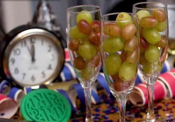 Al llegar la medianoche, las mesas se llenan de pequeños platos o vasos con 12 uvas, una por cada mes del año que comienza.