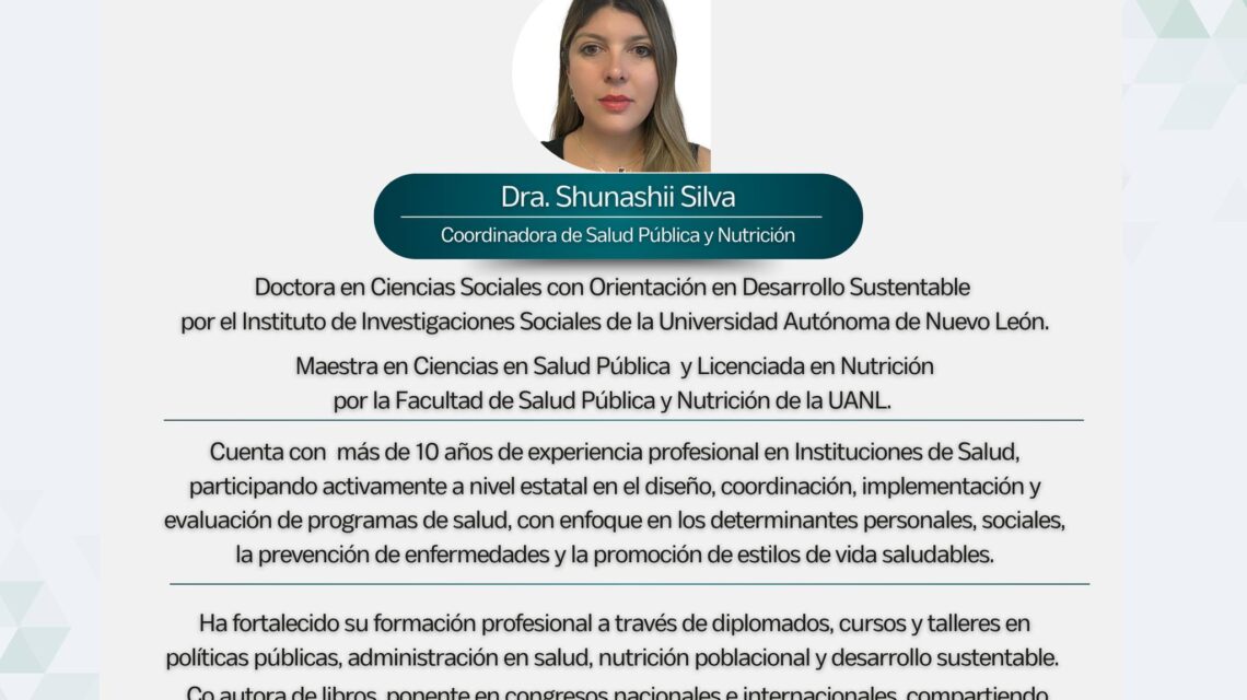 La dependencia municipal difundió una ficha informativa con el perfil profesional de la especialista, destacando que la Dra. Silva es Doctora en Ciencias Sociales con Orientación en Desarrollo Sustentable, egresada del Instituto de Investigaciones de la Universidad Autónoma de Nuevo León (UANL).
