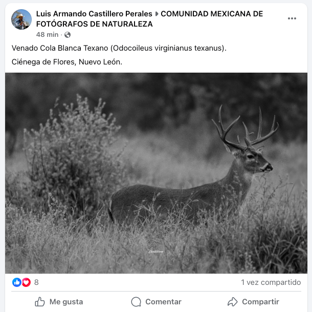 El usuario Luis Armando Castillero Perales compartió recientemente una imagen de fauna silvestre en el grupo COMUNIDAD MEXICANA DE FOTÓGRAFOS DE NATURALEZA, donde documentó la presencia de un ejemplar de venado cola blanca texano en el municipio de Ciénega de Flores, Nuevo León.