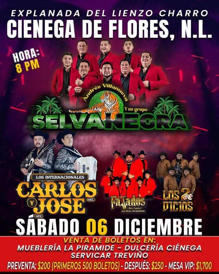 A través de un video publicado en redes sociales, el artista Andrés Villanueva, voz y líder de la agrupación Selva Negra, invitó a la comunidad al Gran Baile que se celebrará el próximo sábado 6 de diciembre en la Explanada del Lienzo Charro de Ciénega de Flores, Nuevo León.