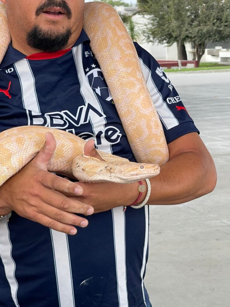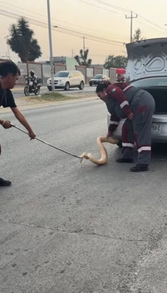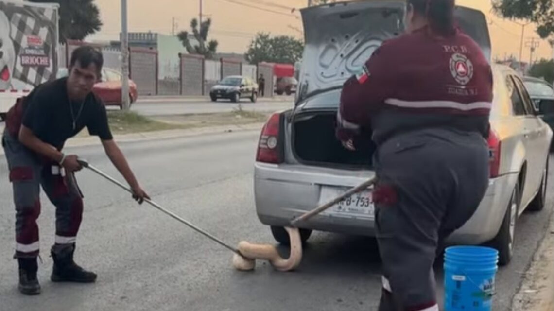 Una joven automovilista vivió momentos de pánico en Zuazua, Nuevo León, tras descubrir que una serpiente pitón de más de dos metros se ocultaba en la parte trasera de su vehículo.