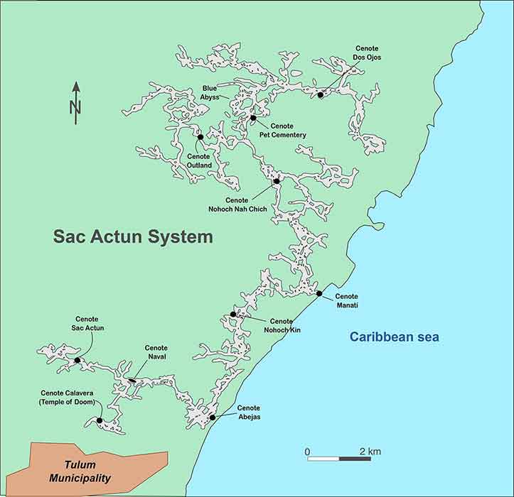 Actualmente, el Sistema Sac Actun cuenta con más de 220 cenotes que reciben agua mediante la filtración de lluvia y los ríos subterráneos que los conectan.