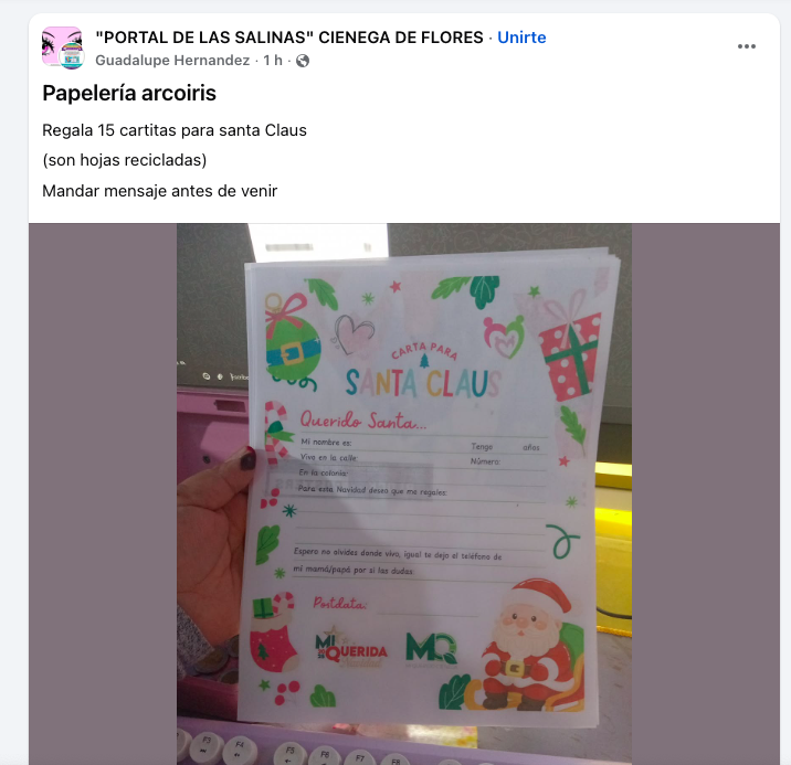 Como acto de altruismo hacia la ciudadanía de Ciénega de Flores, la Papelería Arcoiris anunció que regalará 15 cartas para Santa Claus, en apoyo a las actividades del programa municipal “Entrega tu Carta a Santa Claus”, impulsado por el DIF local encabezado por Perla Cavazos.
