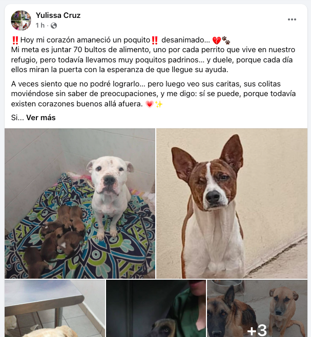 La ciudadana Yulissa Cruz, conocida por su labor en defensa de los perros abandonados, lanzó un llamado urgente a través de redes sociales para reunir 70 bultos de alimento, uno por cada perro que vive en su refugio en Ciénega de Flores.