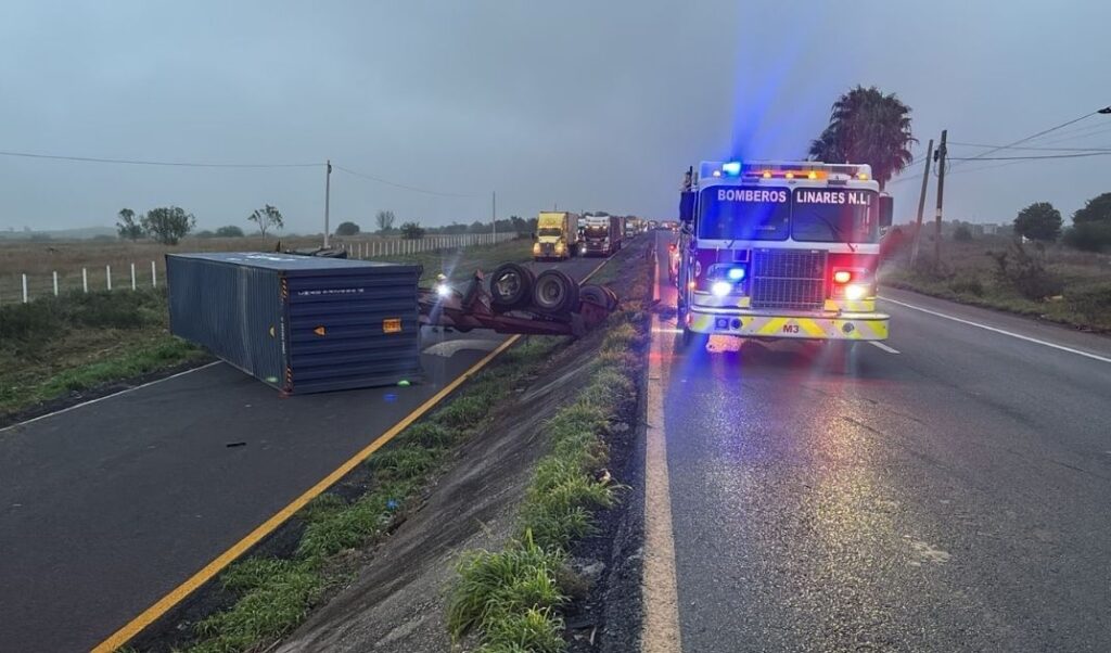 La volcadura de un tráiler provocó el cierre parcial de la Carretera Nacional, en el tramo que conecta Linares con Montemorelos, generando largas filas y retrasos de varios kilómetros.