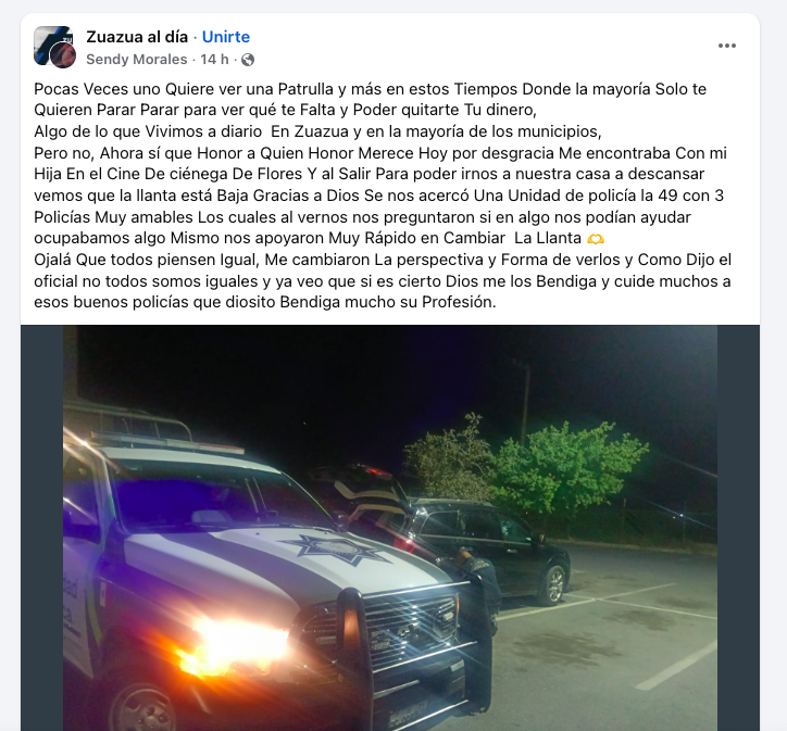 En redes sociales se volvió viral el agradecimiento de una mujer hacia elementos de seguridad pública que se detuvieron para ayudarla a cambiar una llanta ponchada en Ciénega de Flores.