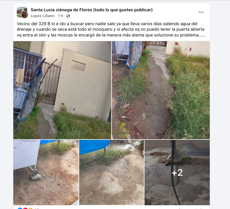 A través del grupo comunitario “Santa Lucía Ciénega de Flores (todo lo que gustes publicar)”, el denunciante explicó que el agua del drenaje brota de manera continua y, al secarse, deja un entorno insalubre con fuerte olor y proliferación de moscas, lo que le impide incluso mantener abiertas las puertas de su vivienda.